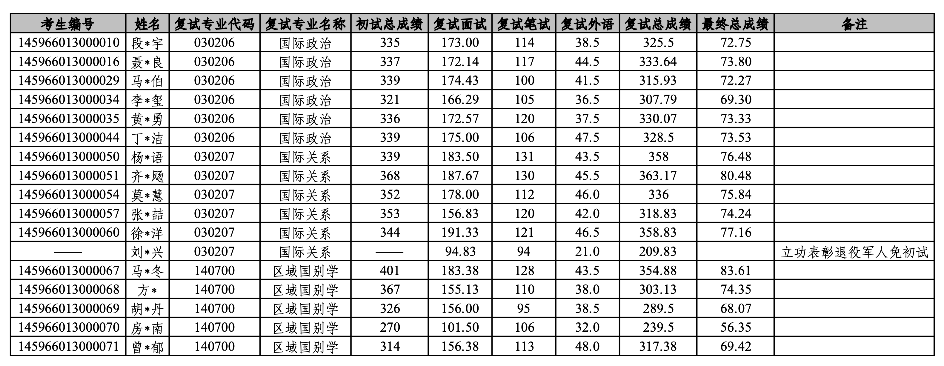 全球与区域国别欧美色情片于3月21日组织完成区域国别学、国际政治、国际关系三个专业的硕士研究生招生复试,现将复试结果公布如下:
